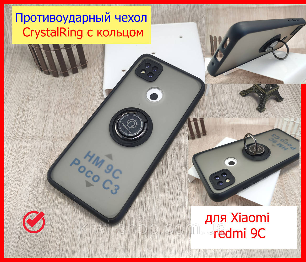 Протиударний чохол для Xiaomi redmi 9C CrystalRing чорний, Ударостійкий чохол редмі 9 с із кільцем